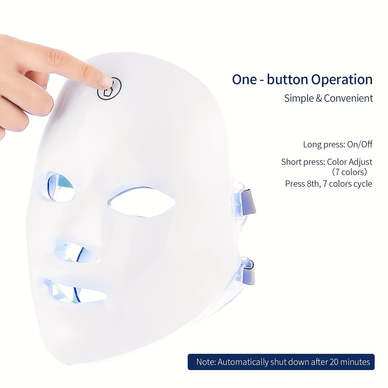 Steps 1. Clean the skin of the face and dry the face after use 2. Remove the color mask and tie the elastic band on the left and right side of the face.3、 Press the touch mark with your finger. [Long press for 3 seconds] Turn on the machine, turn on the machine. [Touch switch] For Switch colors, touch until the eighth time to automatically For Switch colors.[Long press 3 seconds] Shut down.4 When used for 10 minutes, the machine will automatically shut down, the light will flash, and it can be fully cha