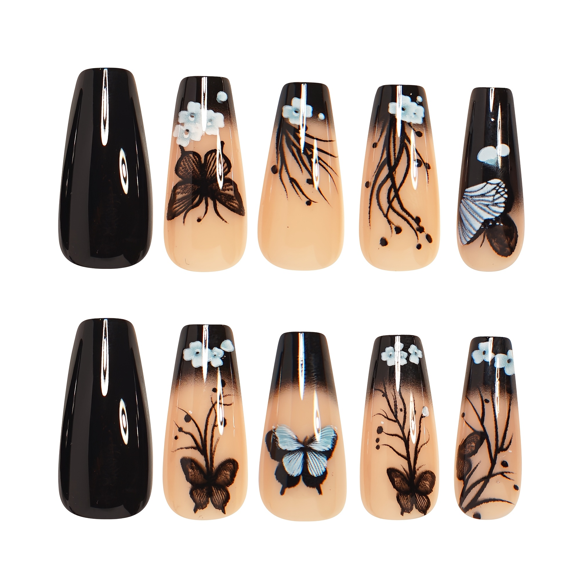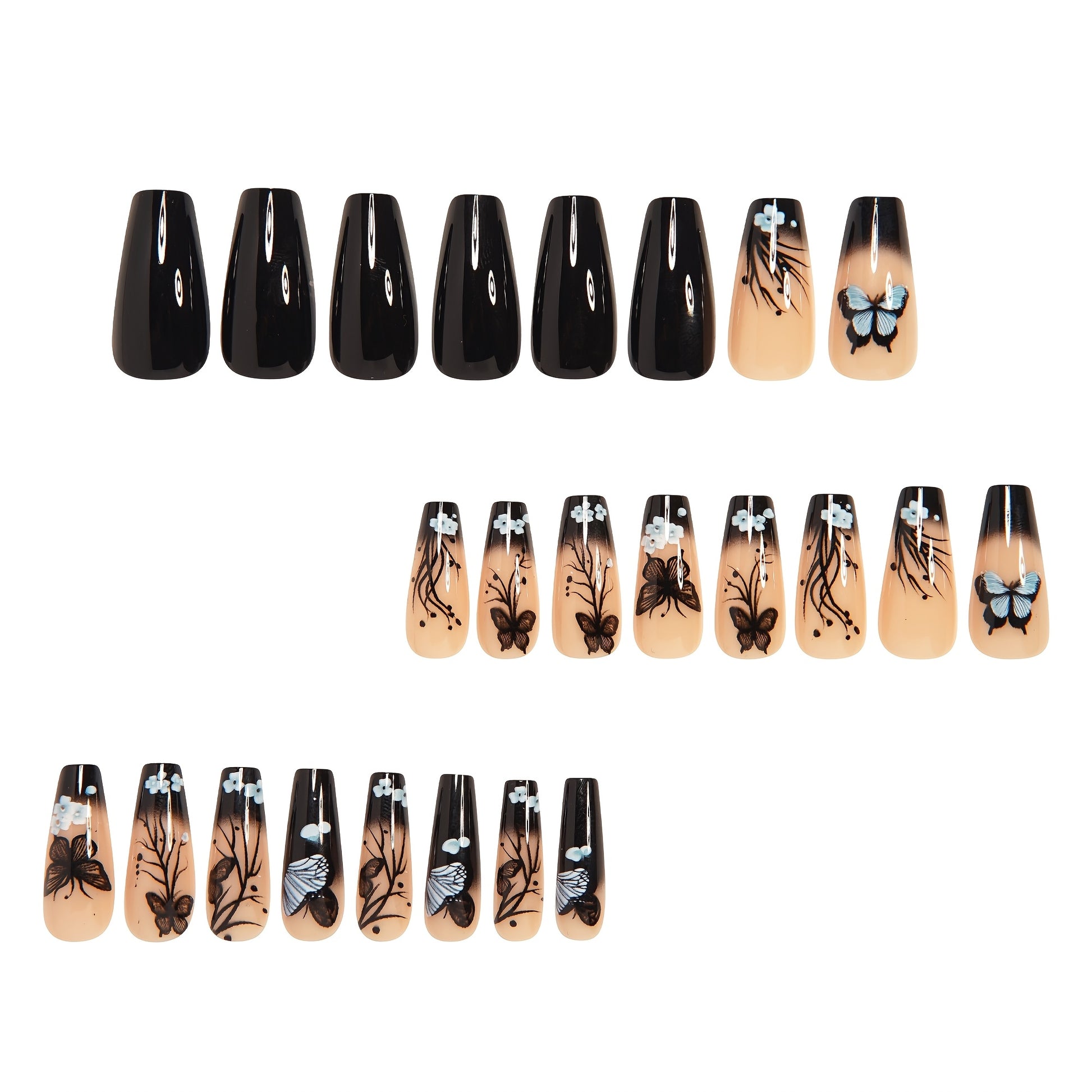 24pcs Medium Ballet Nails Classic Retro Black Gradient Trees Flowers Butterflies Glossy French False Nails Fashionable Wear Removable Press-on N